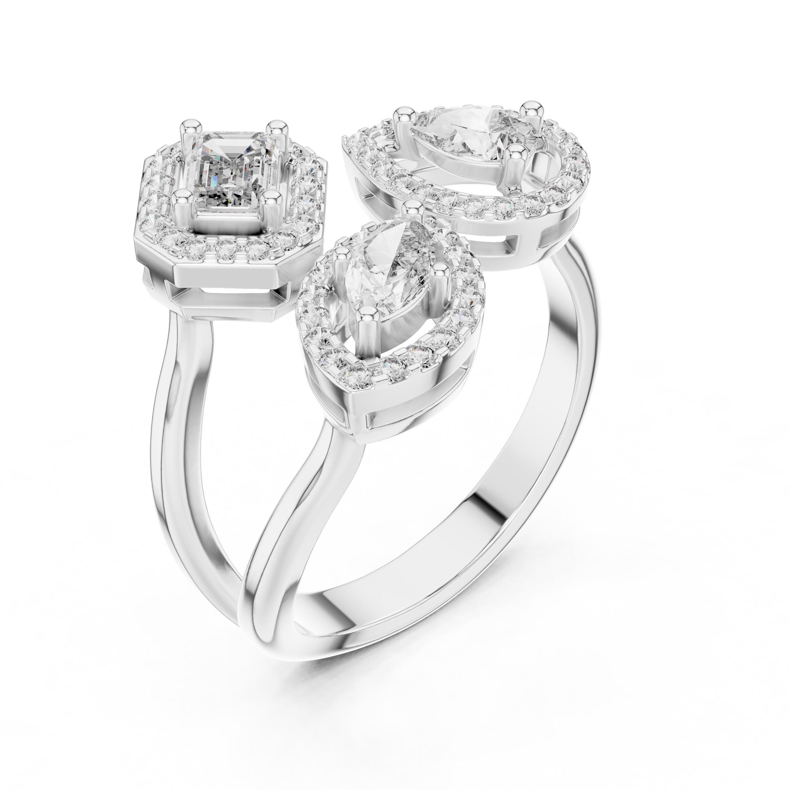 Make a statement with this stunning three-stone diamond ring crafted in 925 Silver ,solid 14K or 18K gold. Featuring a pear cut, marquise cut, and emerald cut Lab Grown diamond, each surrounded by a sparkling halo, this unique cluster design offers modern elegance with timeless brilliance.